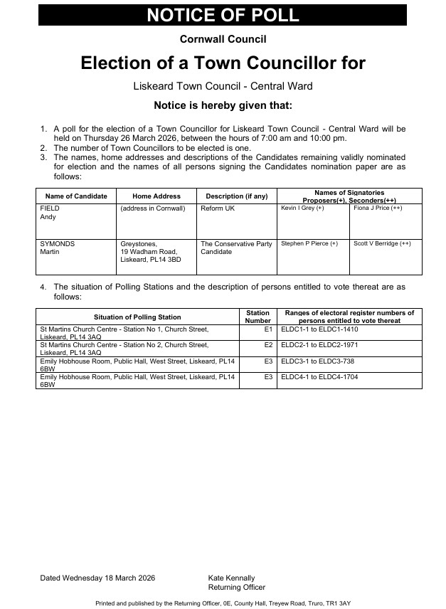 1. A poll for the election of a Town Councillor for Liskeard Town Council – Central Ward will be